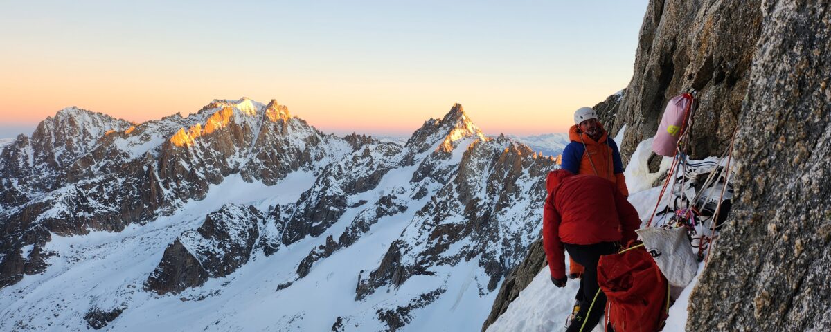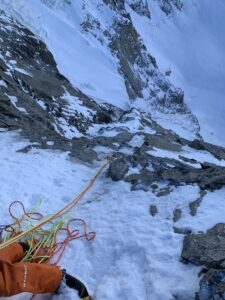 Nach einer Nacht in der Hütte d’Argentière stieg das Team zunächst über den unteren Teil der klassischen Nordwand-Route ein, bevor es auf die Jin-Go-Lo-Bar-Linie wechselte, die ihnen die logischste erschien. Nach einigen anfänglichen Überlegungen entschieden sie sich schließlich für eine direkte Linie durch die Headwall, mit ausgesetzter und lohnender Kletterei.